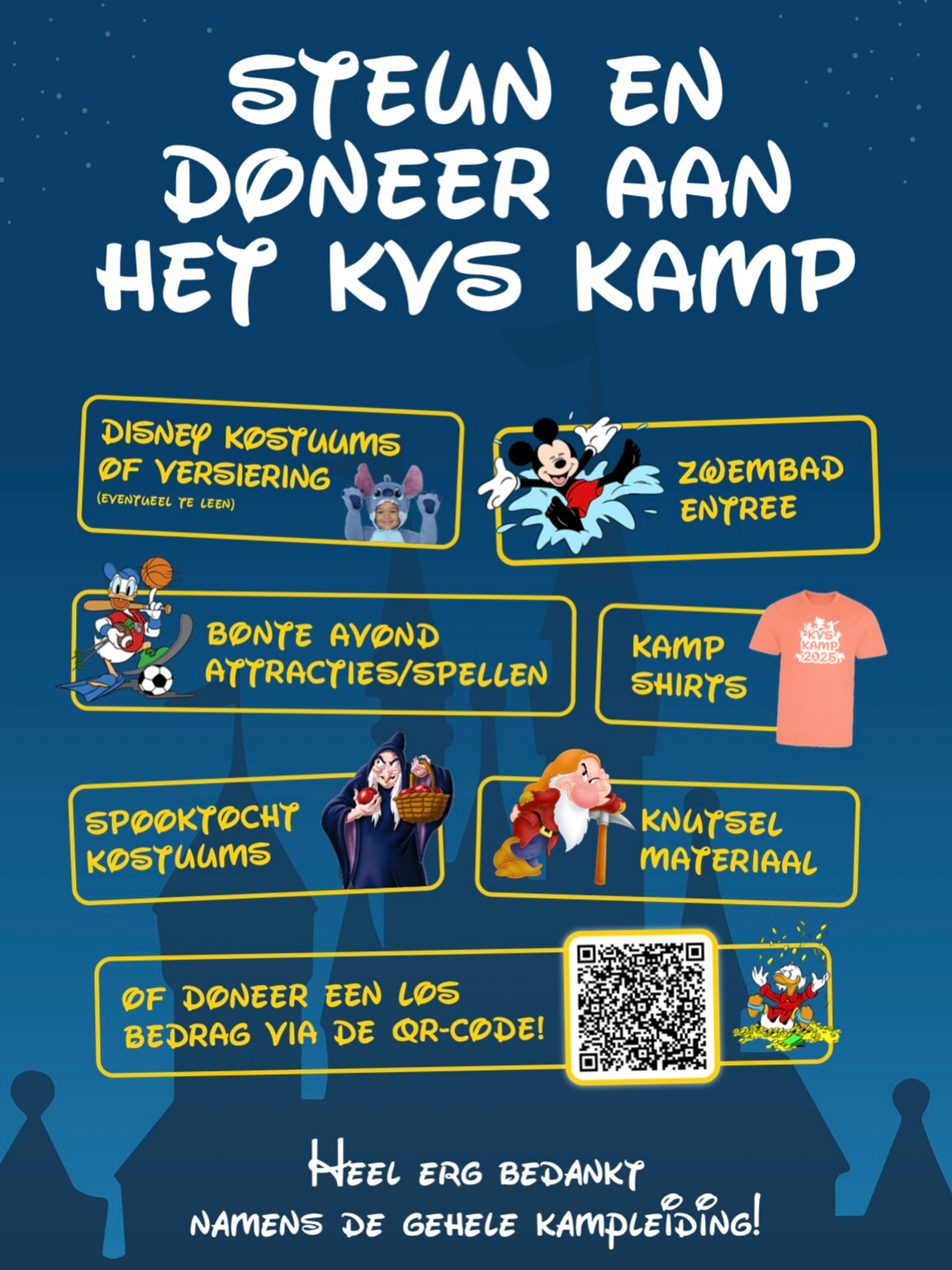 Heb je nog-Disney kostuums, knutselmateriaal of een bijdrage over voor de leukste week van het jaar? Je kunt doneren voor de bonte avond, de kampshirts of voor het dagje zwembad.
